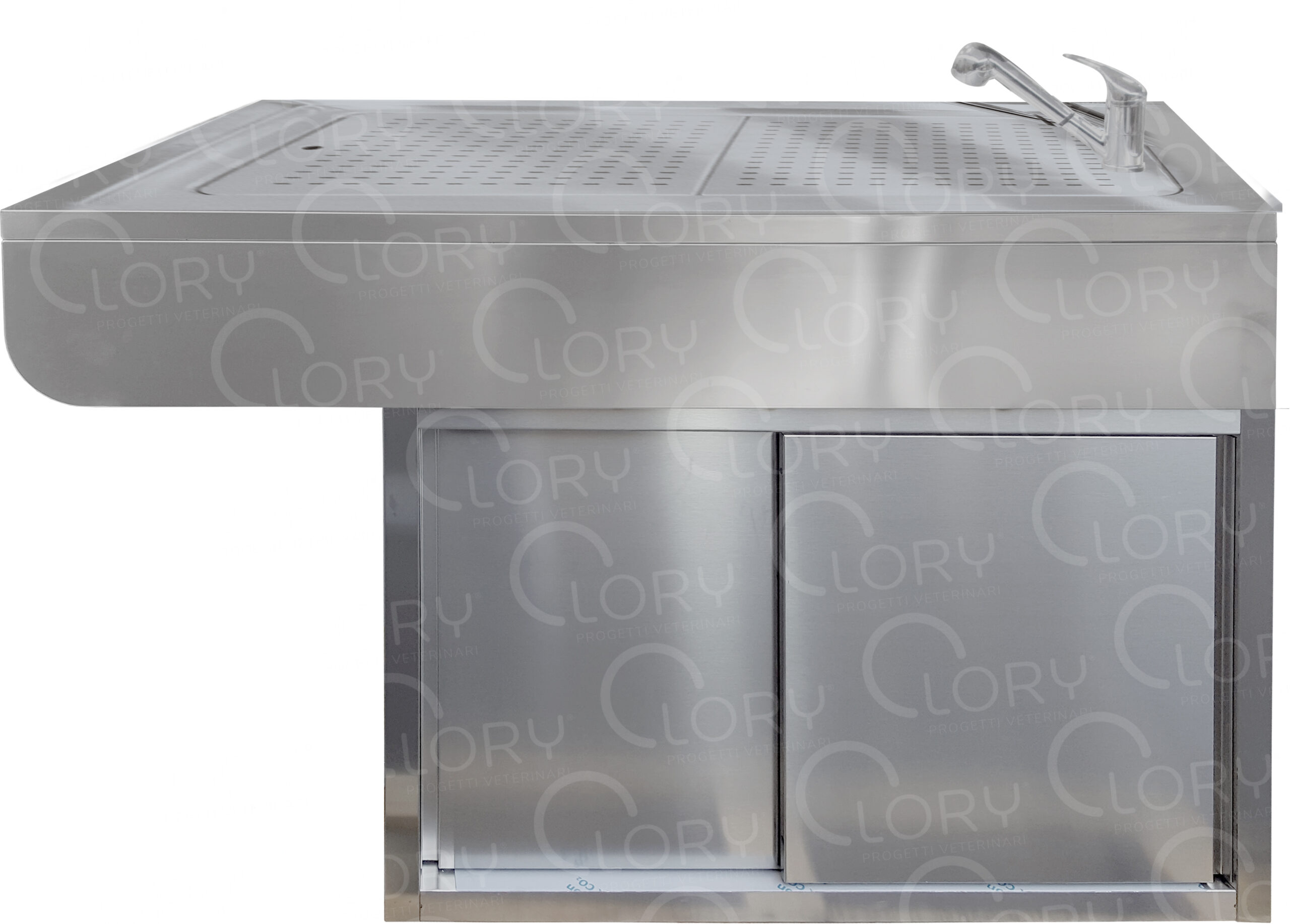 Made of Aisi 304 stainless steel with molded bottom for perfect disinfection. Equipped with pull-out mixer with hand shower. Stainless steel cabinet with sliding doors. Ergonomic model with cantilevered section with rounded lines.