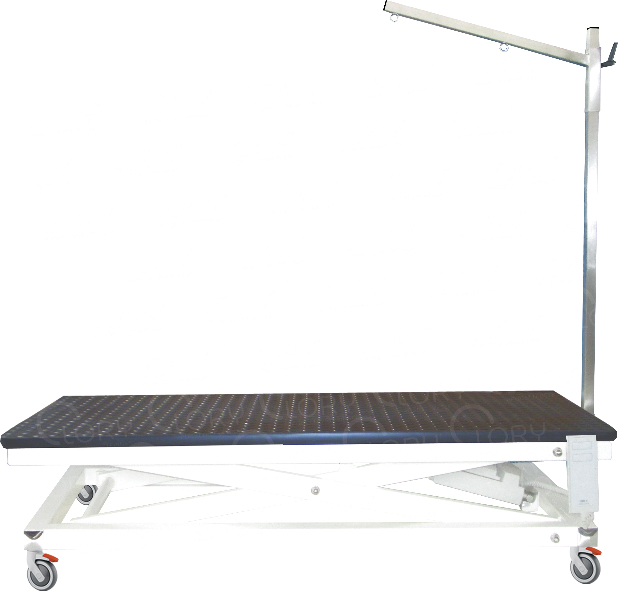 Electric grooming table with vertical movement operated by 2-command hand control that allows for height modification, made of epoxy coated steel.