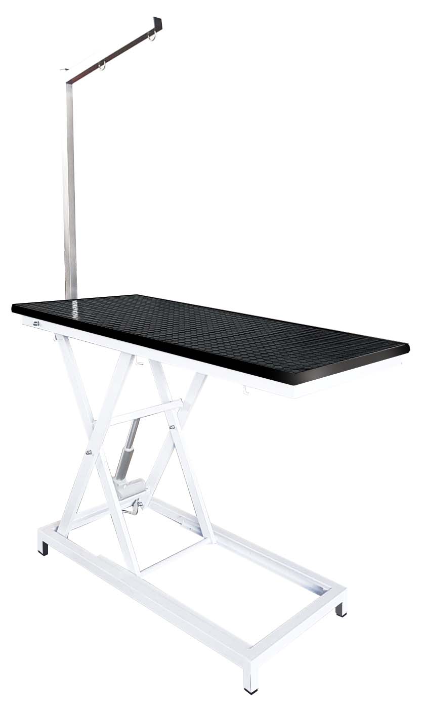 Electric grooming table with vertical movement operated by 2-control push-button panel that allows its height to be changed, made of epoxy-coated steel. Marine plywood top covered with non-slip rubber and anti-shock edging. Version with fixed base.