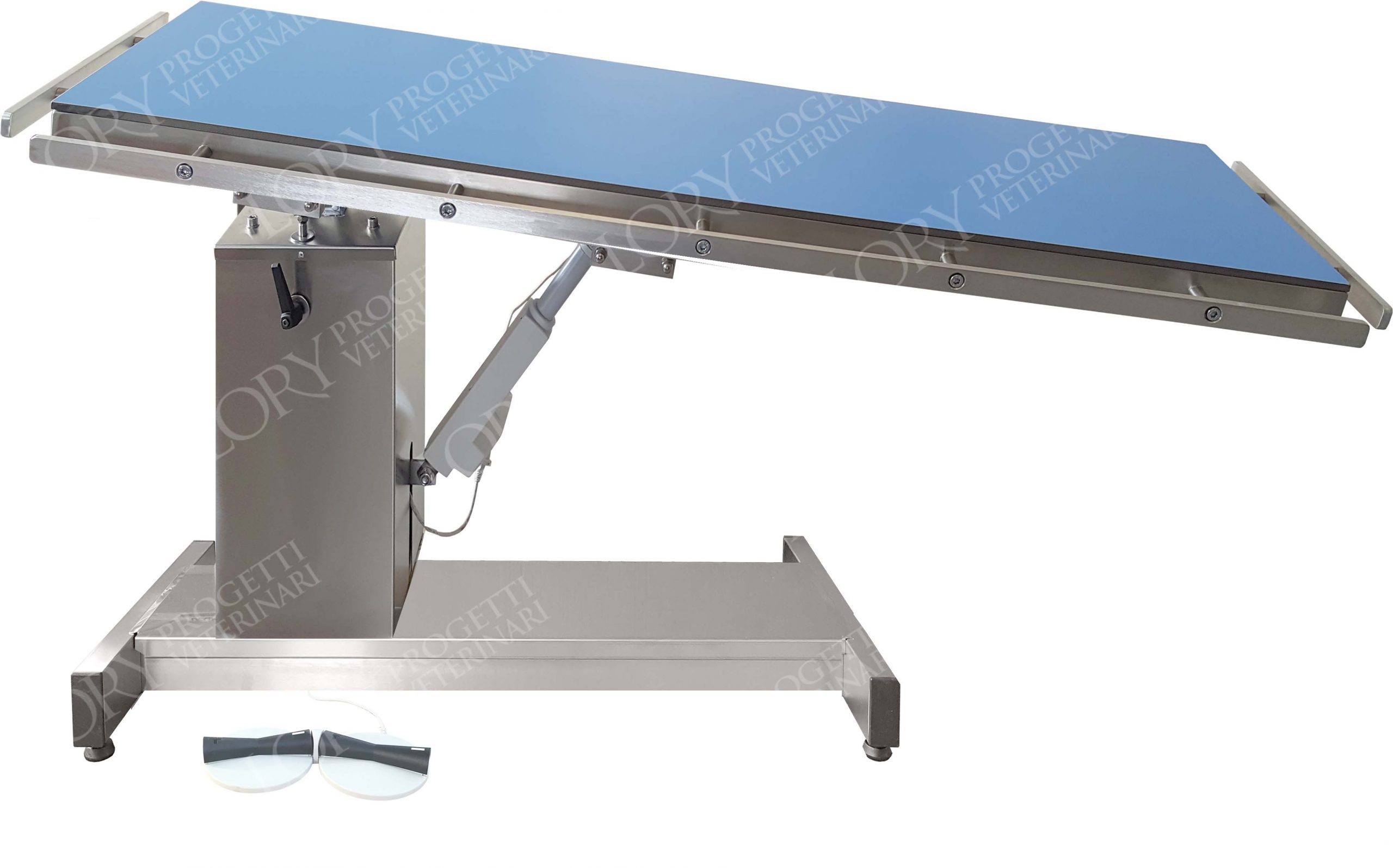 Off-center column-controlled electric operating table with radiolucent laminate top. The special lateral movement allows the doctor to put the patient in the correct operating position. It is equipped with side bars for orthopedics. The frame is made of Aisi 304 stainless steel. It is capable of three movements: electric up and down, manual side tilt and electric Trendelemburg.