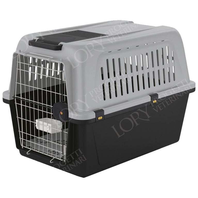Trasportino in resina termoplastica per trasporto. Porta in acciaio plasticato con serratura di sicurezza con 4 punti di fissaggio. Ganci laterali con chiusura a scatto e blocco di sicurezza.