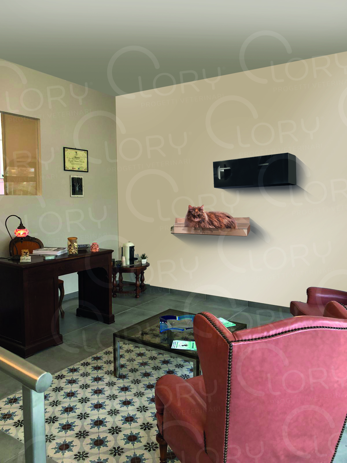 Trespolo gatti da fissare a parete realizzato in policarbonato colorato.